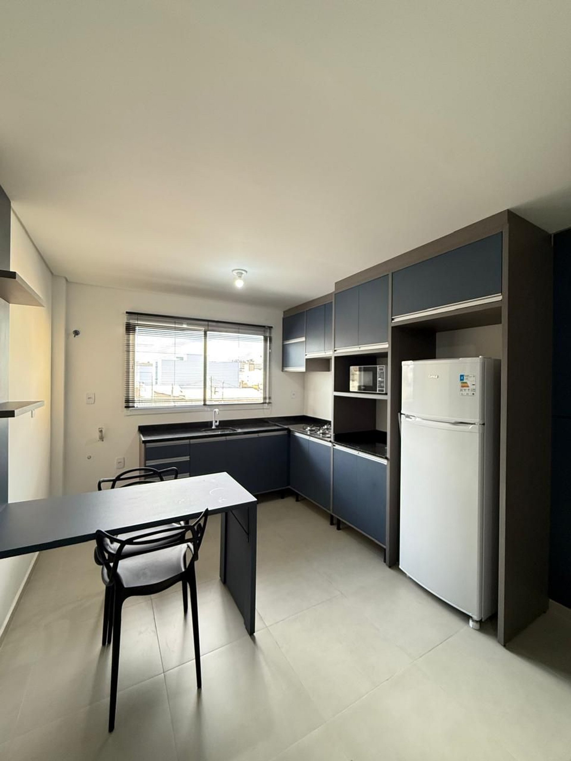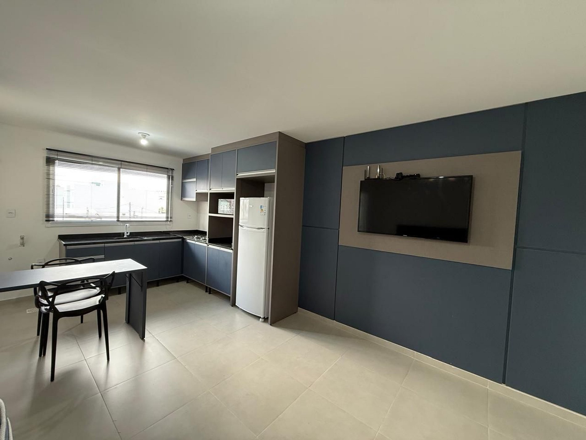 - Conta com armários, cooktop, geladeir, mesa com duas cadeiras, home sem tv, cama, guarda-roupas e banheiro.