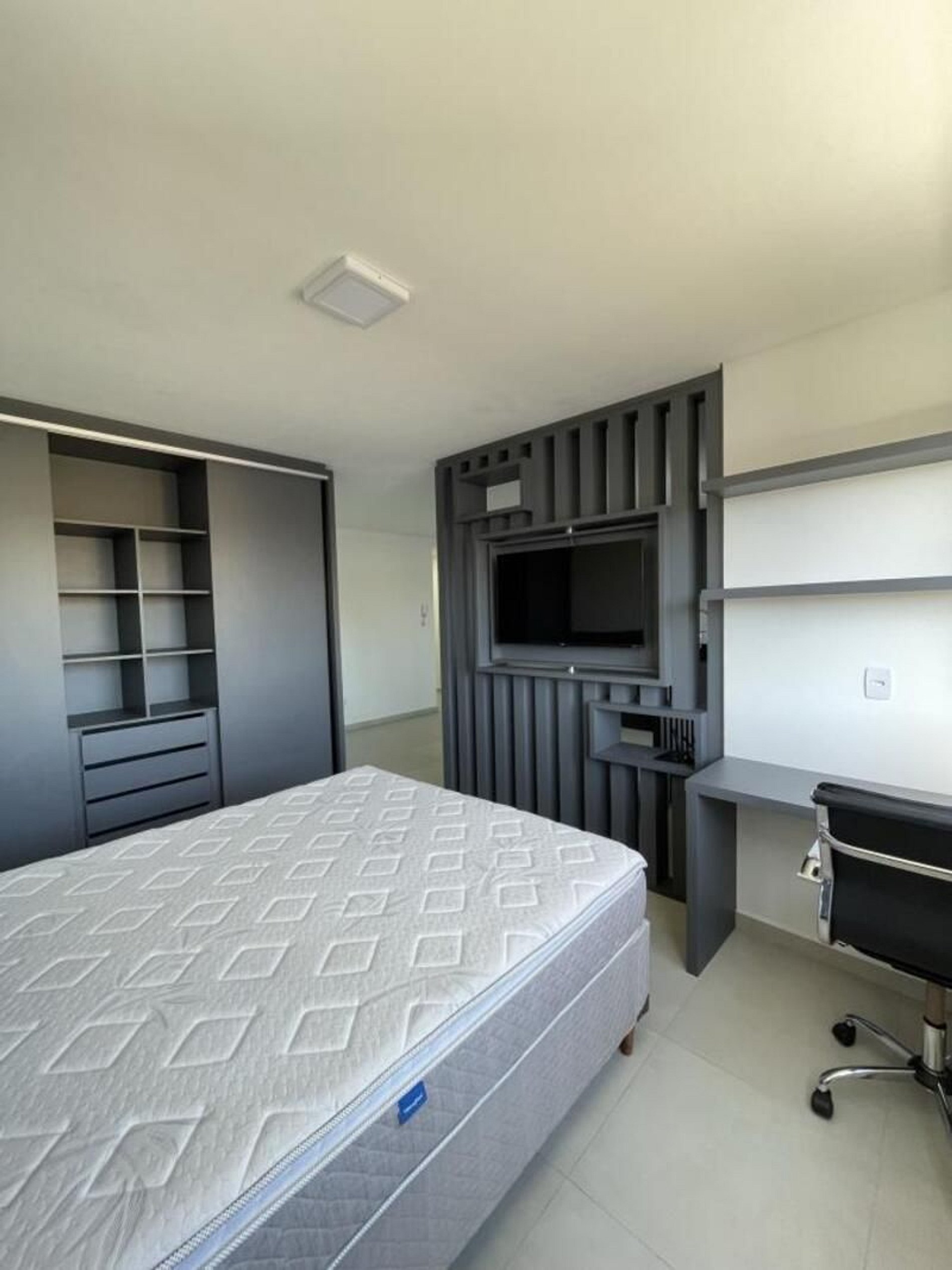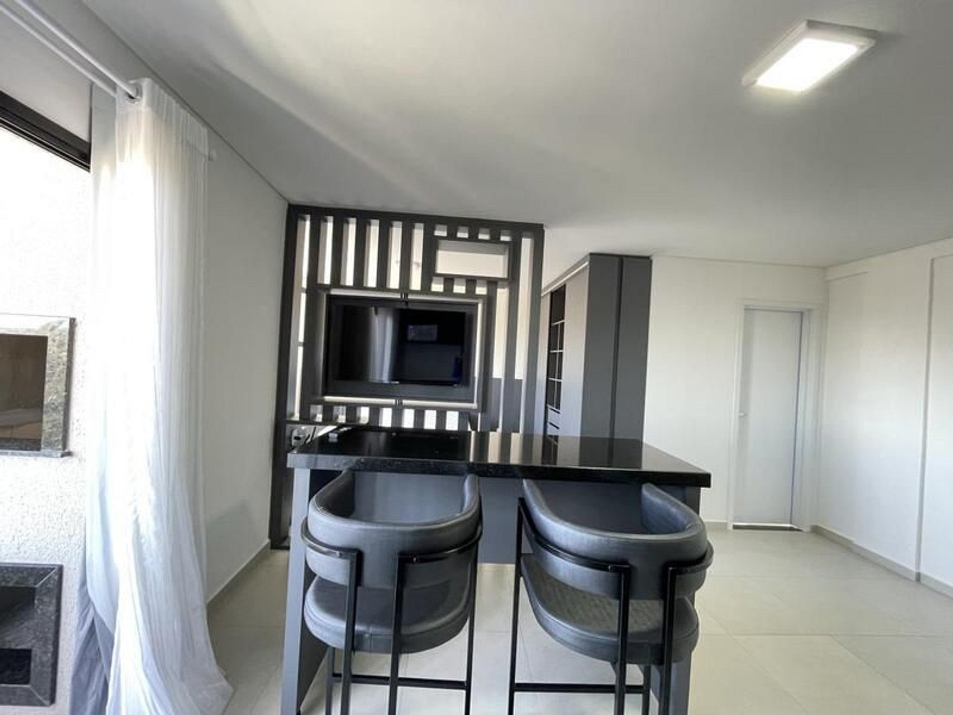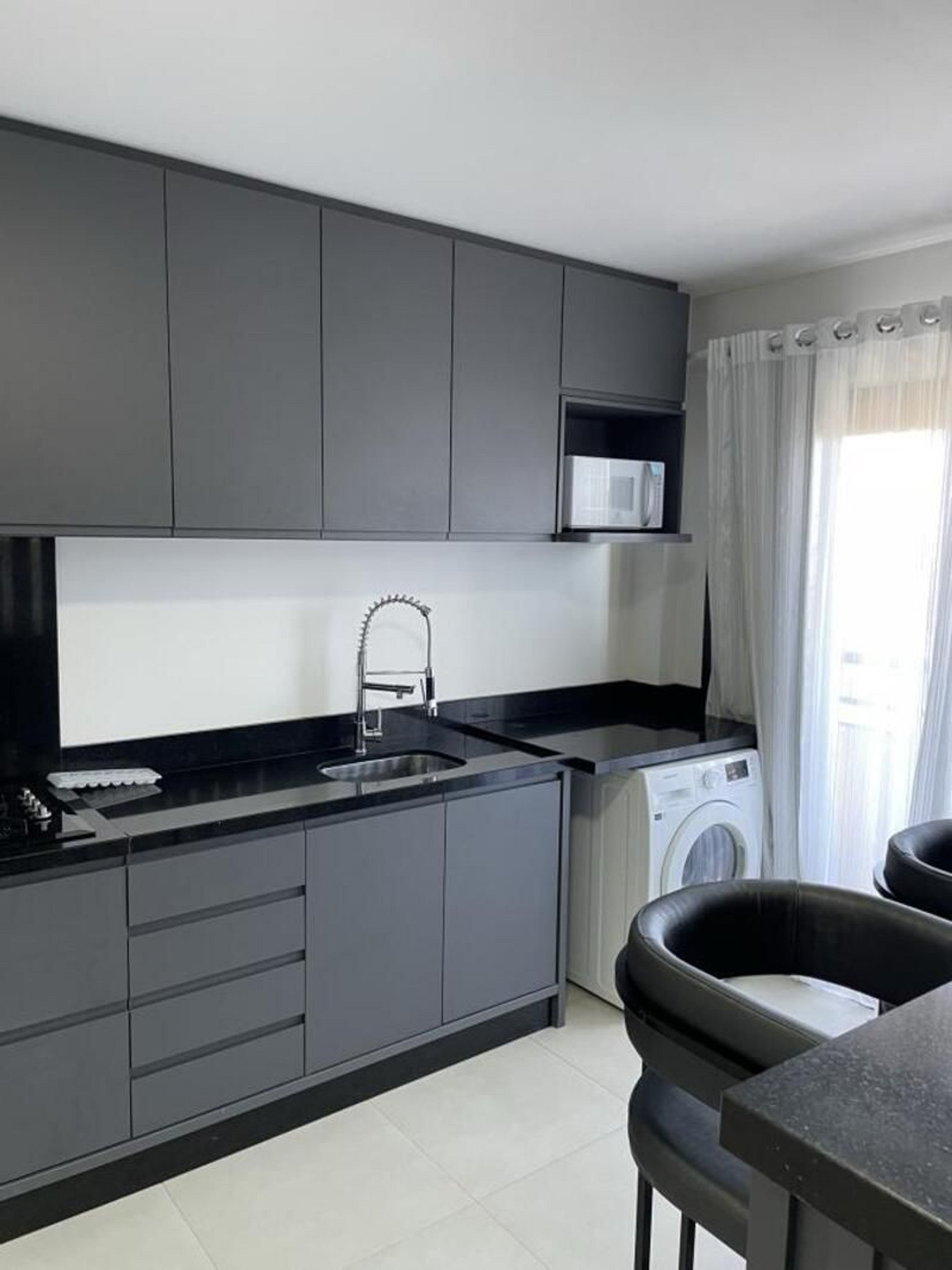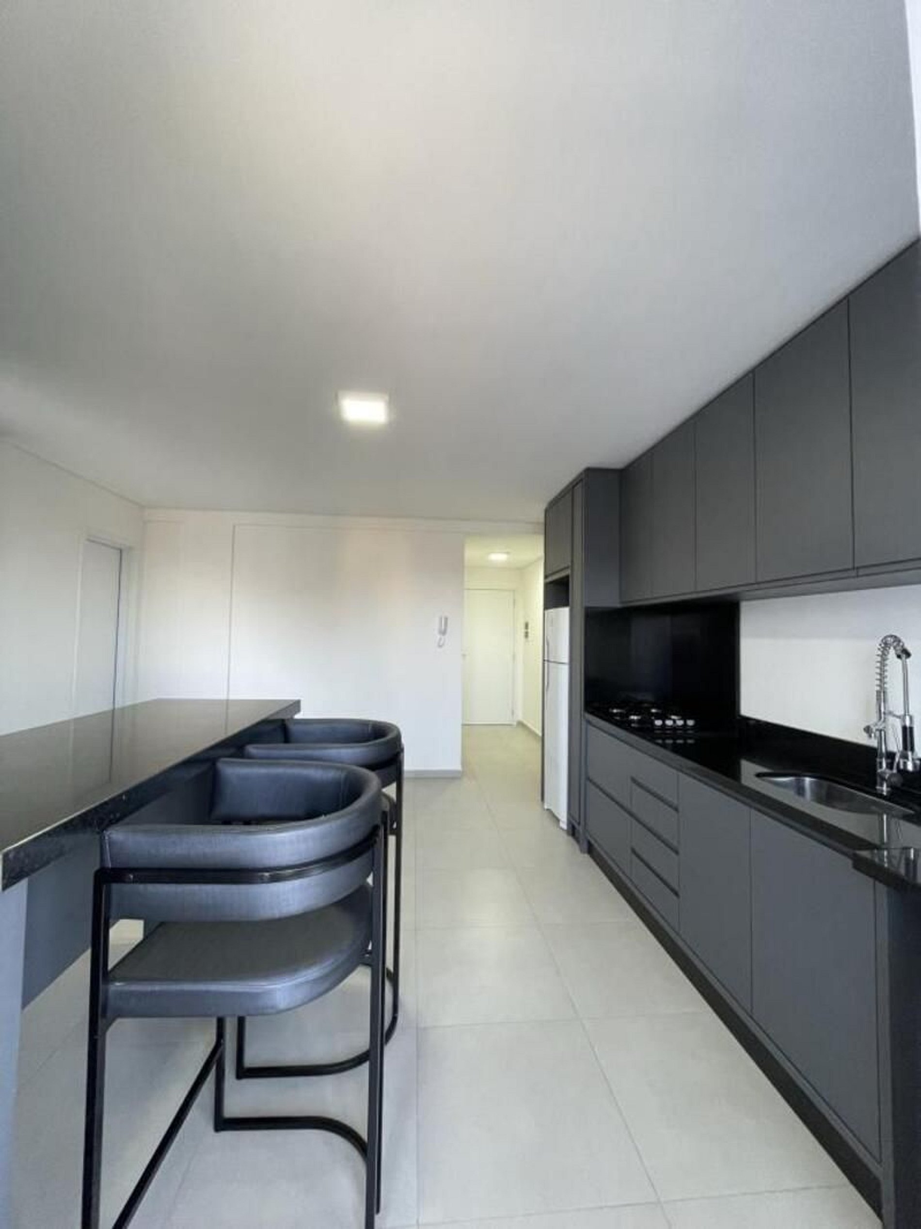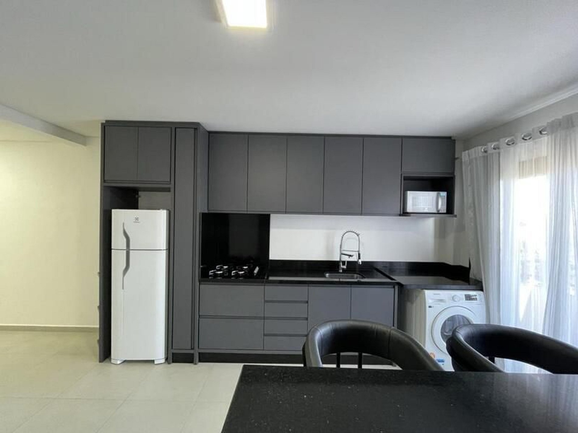 - Possui cozinha toda mobiliada com máquina lava e seca, cooktop, geladeira, microondas, bancada móvel com duas banquetas, home dividindo os ambientes com tv smart que gira para a cozinha e quarto, cama, guarda roupas, mesa lateral, banheiro e sacada.