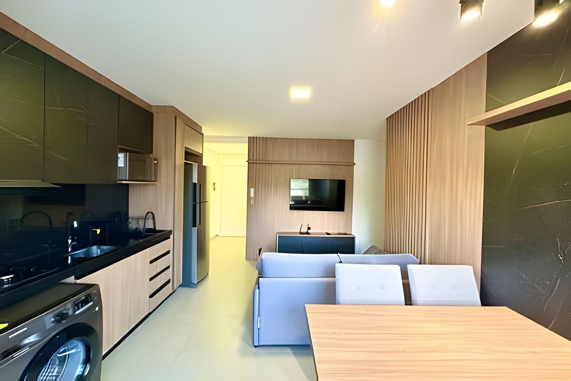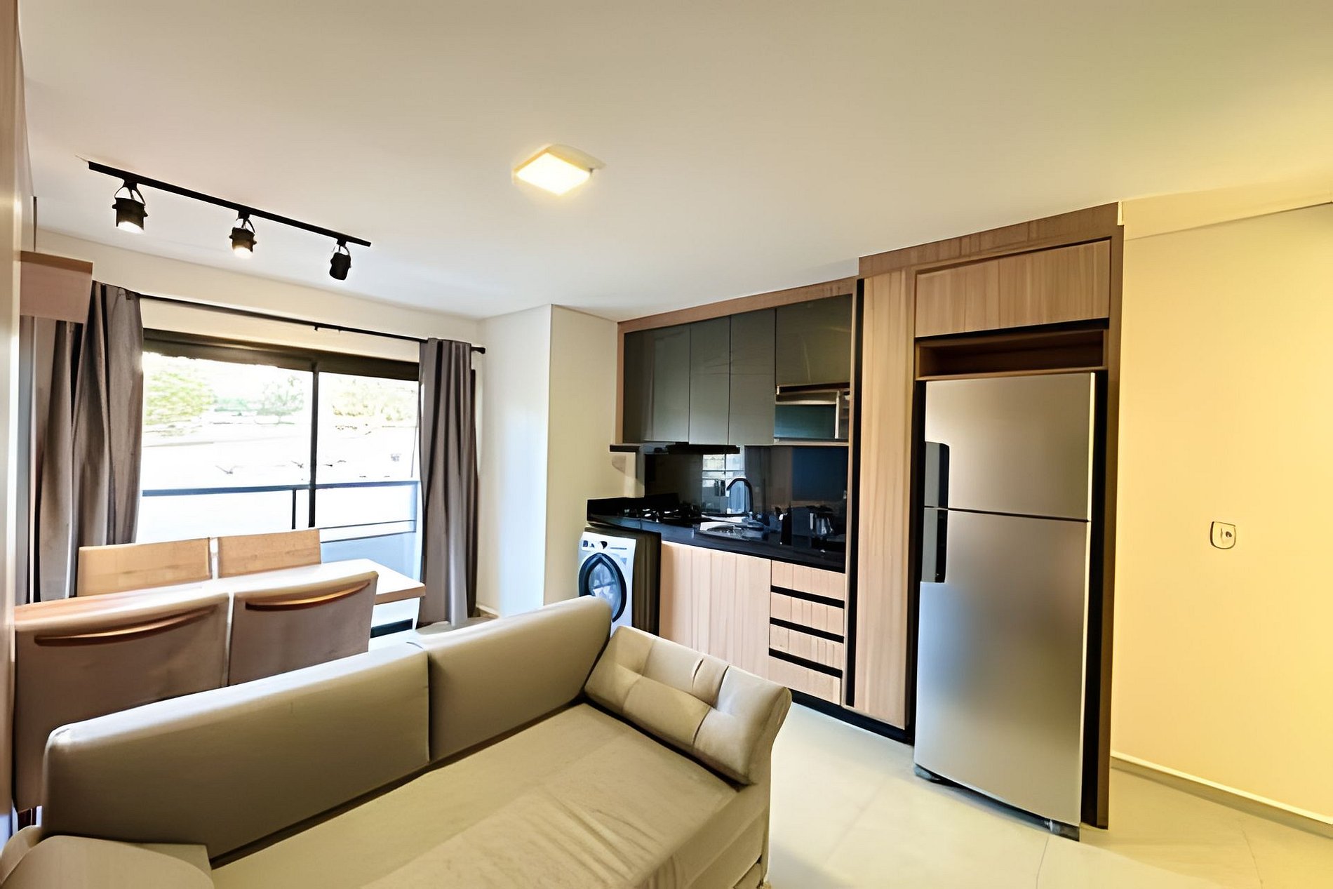 Nosso espaço conta com tudo que o hóspede precisa para uma estadia confortável. Apartamento possui cozinha 100% completa (não possuímos forno), com todos utensílios necessários para a preparação de uma refeição, mesa com quatro cadeiras, geladeira 2 portas, cooktop, micro-ondas, coifa e máquina lava e seca, espaço da sala com sofá-cama que atende até duas pessoas, home e TV SMART, quarto com cama box de casal e guarda-roupas com espelho, banheiro com chuveiro elétrico, além de sacada com churrasqueira. Possui uma vaga de garagem.