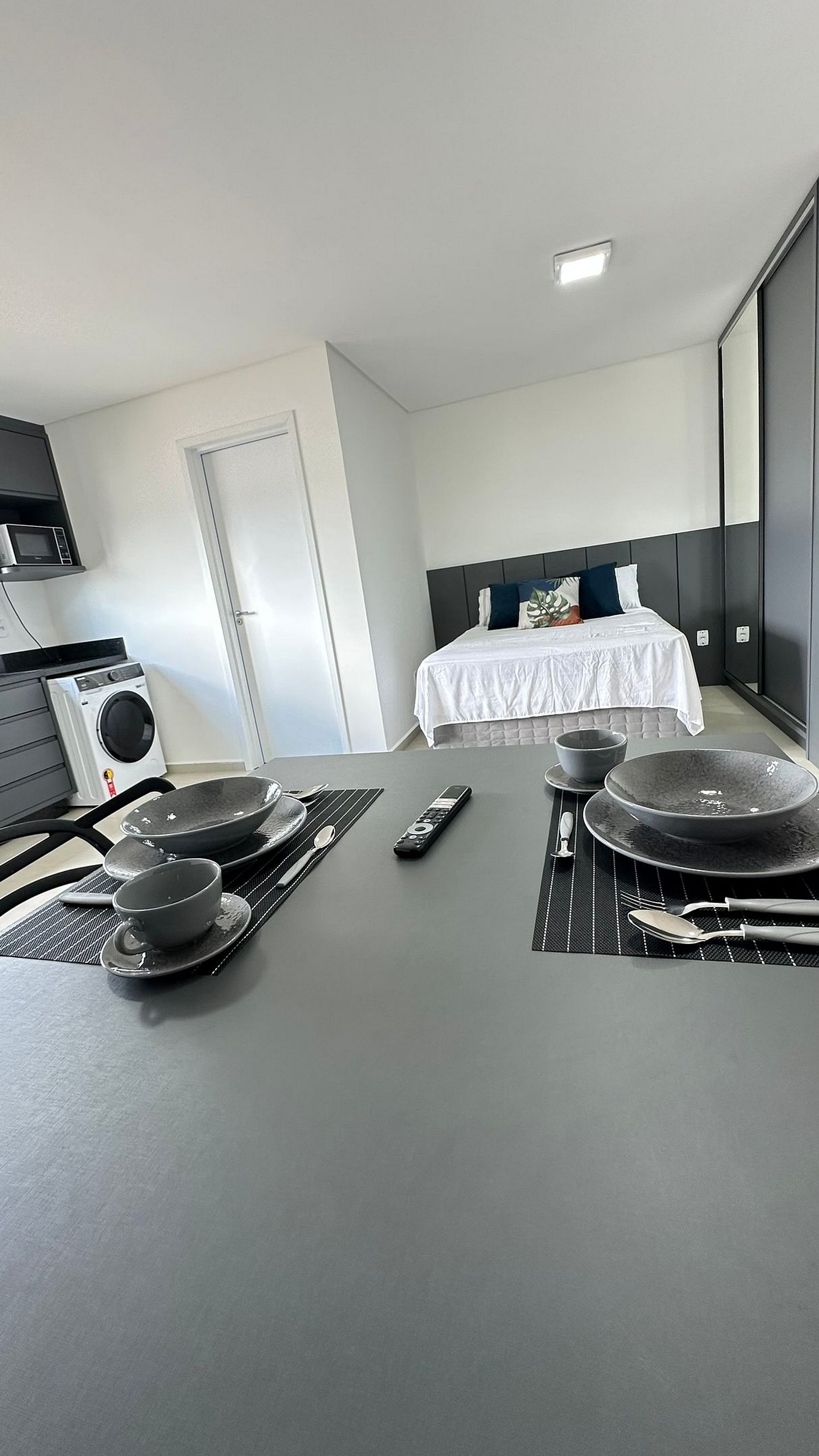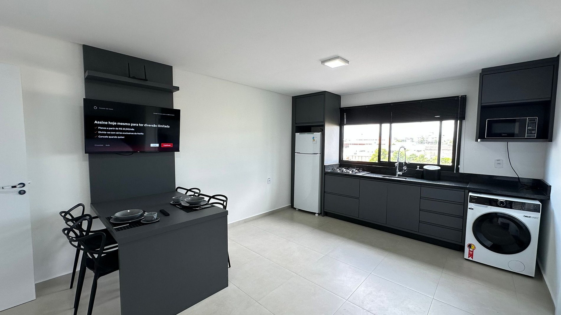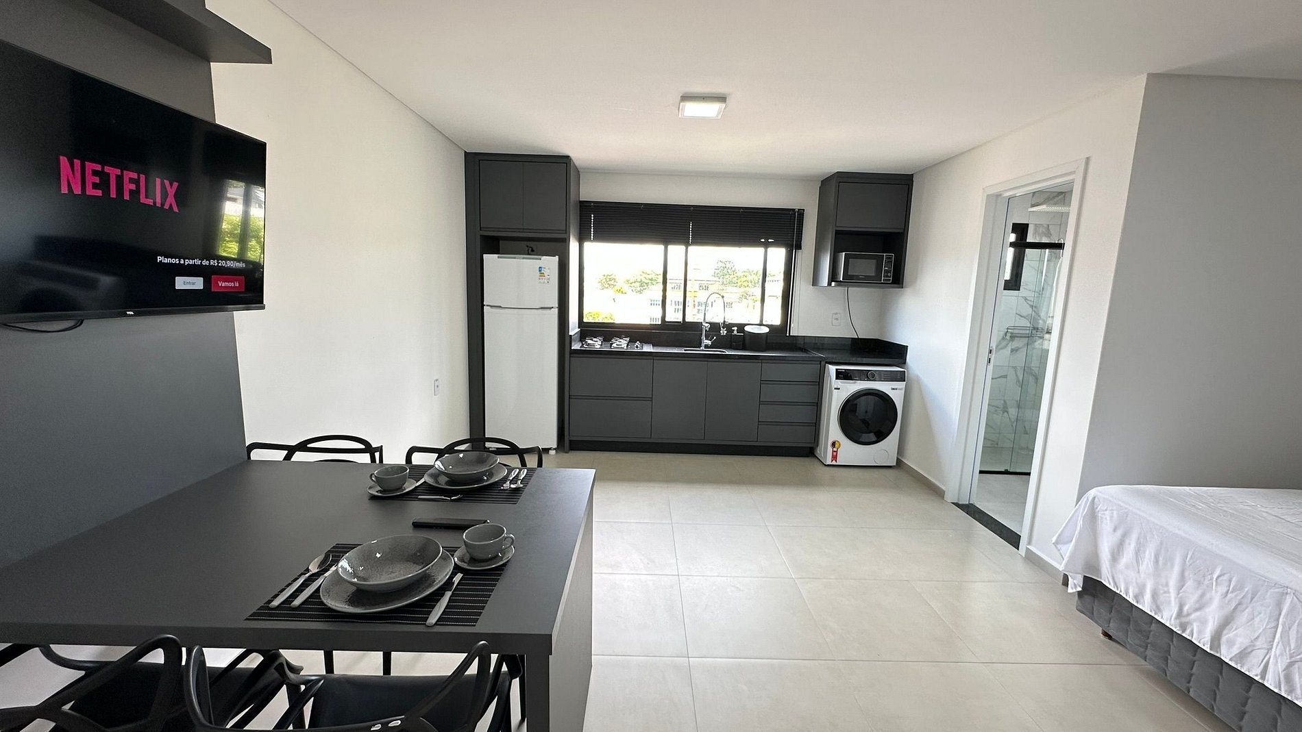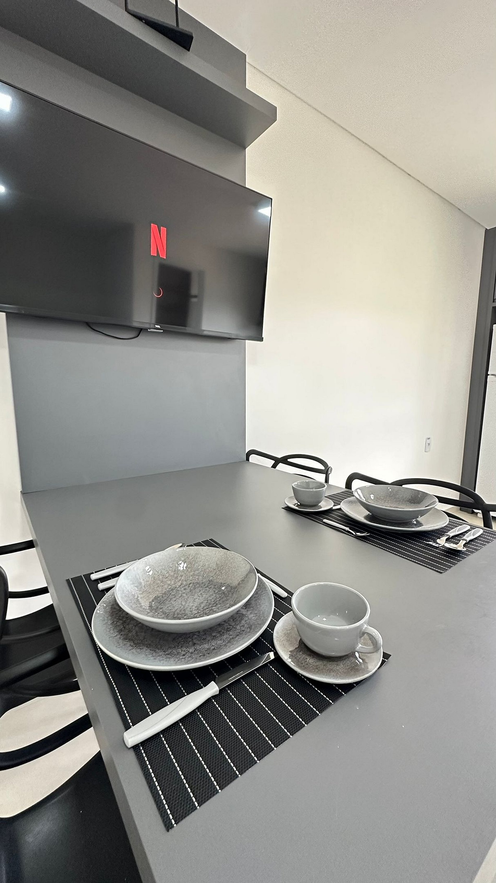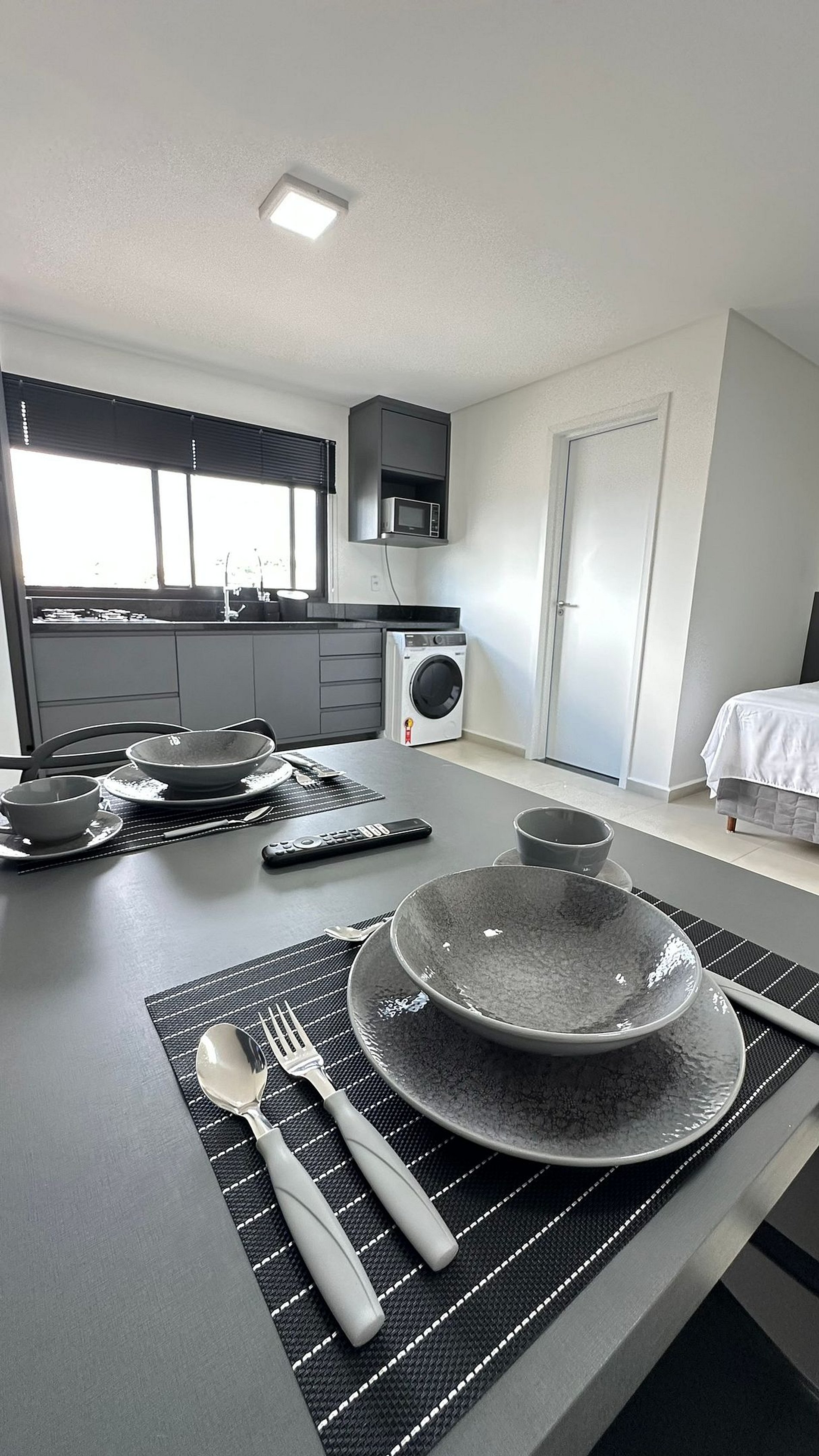 Nosso espaço conta com tudo que o hóspede precisa para uma estadia confortável. Apartamento possui cozinha 100% completa (não possuímos forno), com todos utensílios básicos para a preparação de uma refeição, mesa com quatro cadeiras, geladeira 2 portas, cooktop, micro-ondas e máquina lava e seca, espaço do quarto com cama box de casal e guarda-roupas, painel com TV Smart, banheiro com chuveiro elétrico.