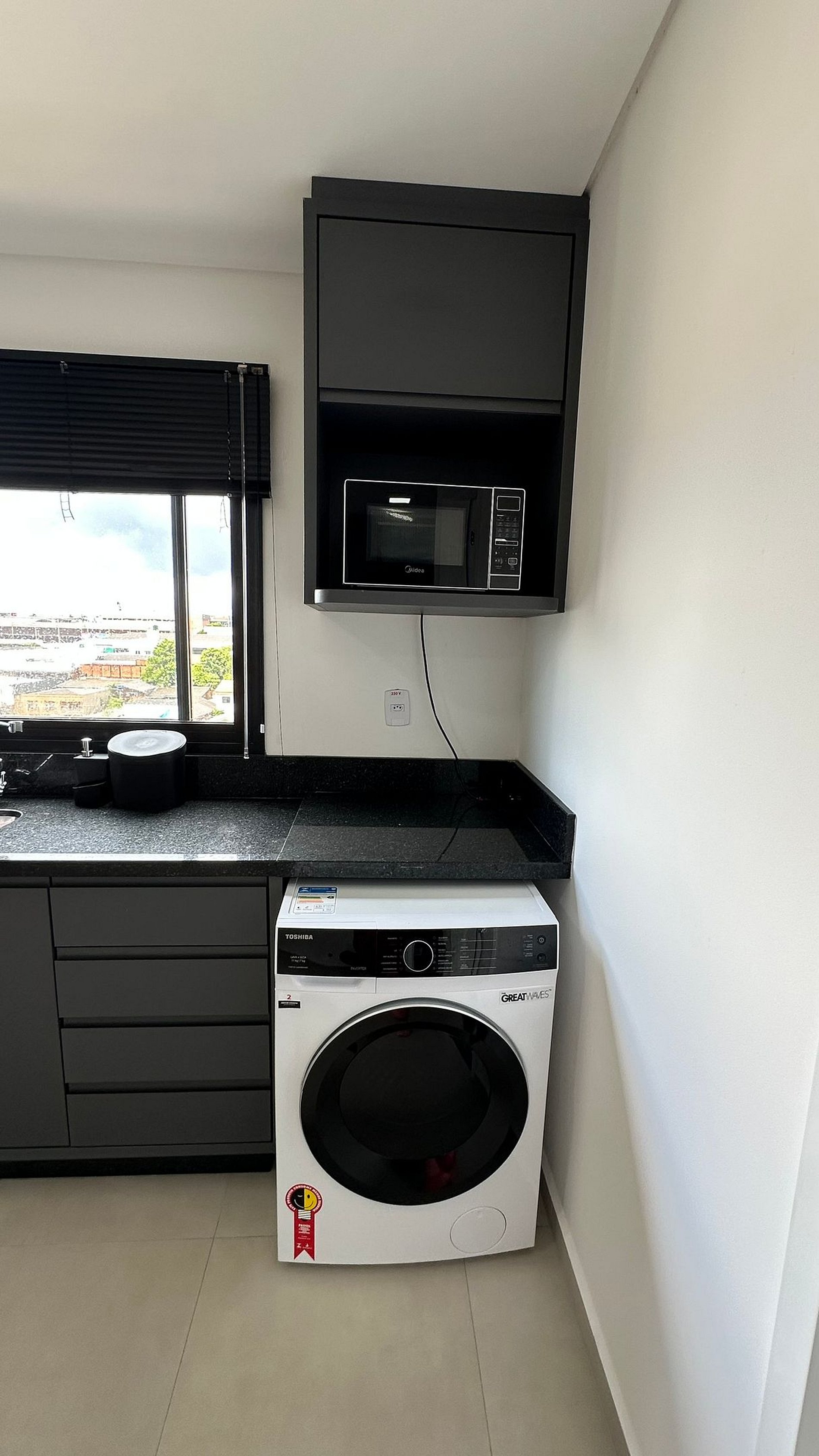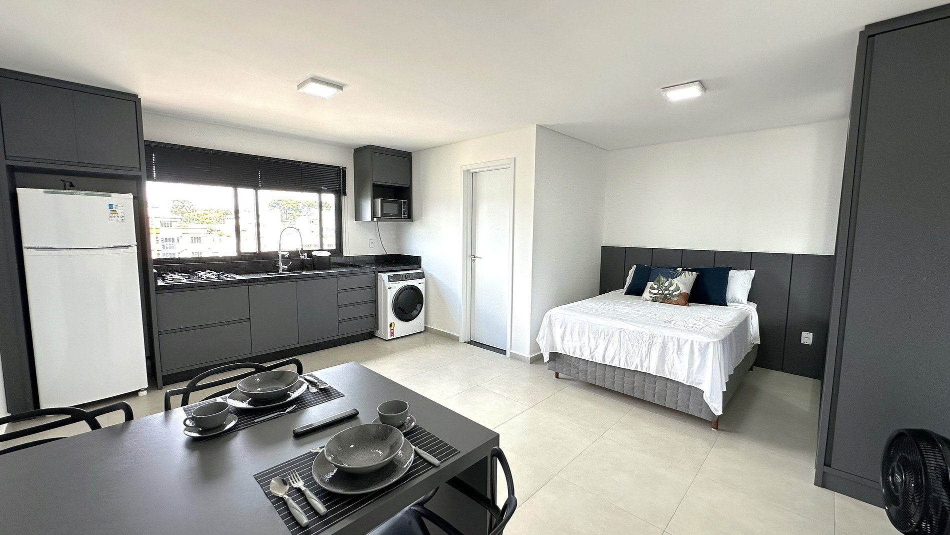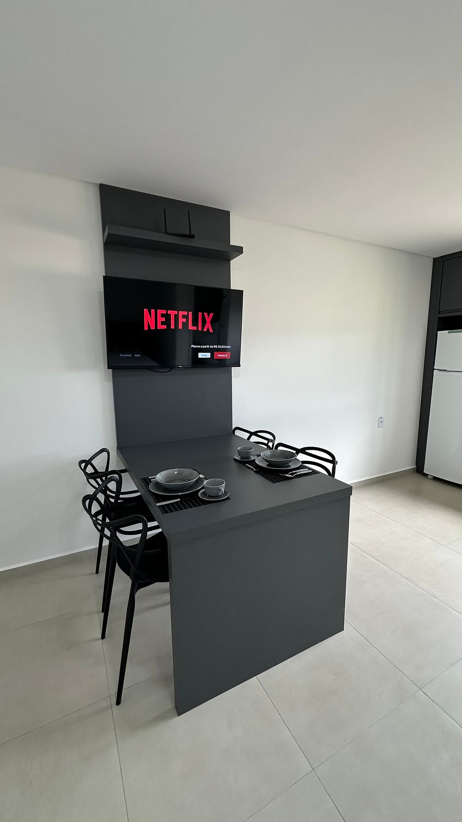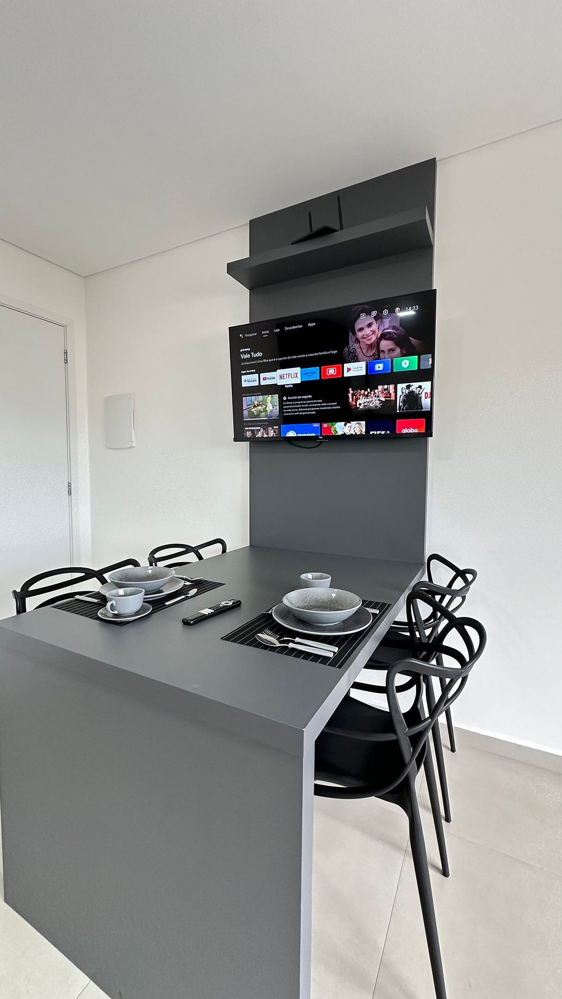 Nosso espaço conta com tudo que o hóspede precisa para uma estadia confortável. Apartamento possui cozinha 100% completa (não possuímos forno), com todos utensílios básicos para a preparação de uma refeição, mesa com quatro cadeiras, geladeira 2 portas, cooktop, micro-ondas e máquina lava e seca, espaço do quarto com cama box de casal e guarda-roupas, painel com TV Smart, banheiro com chuveiro elétrico.
