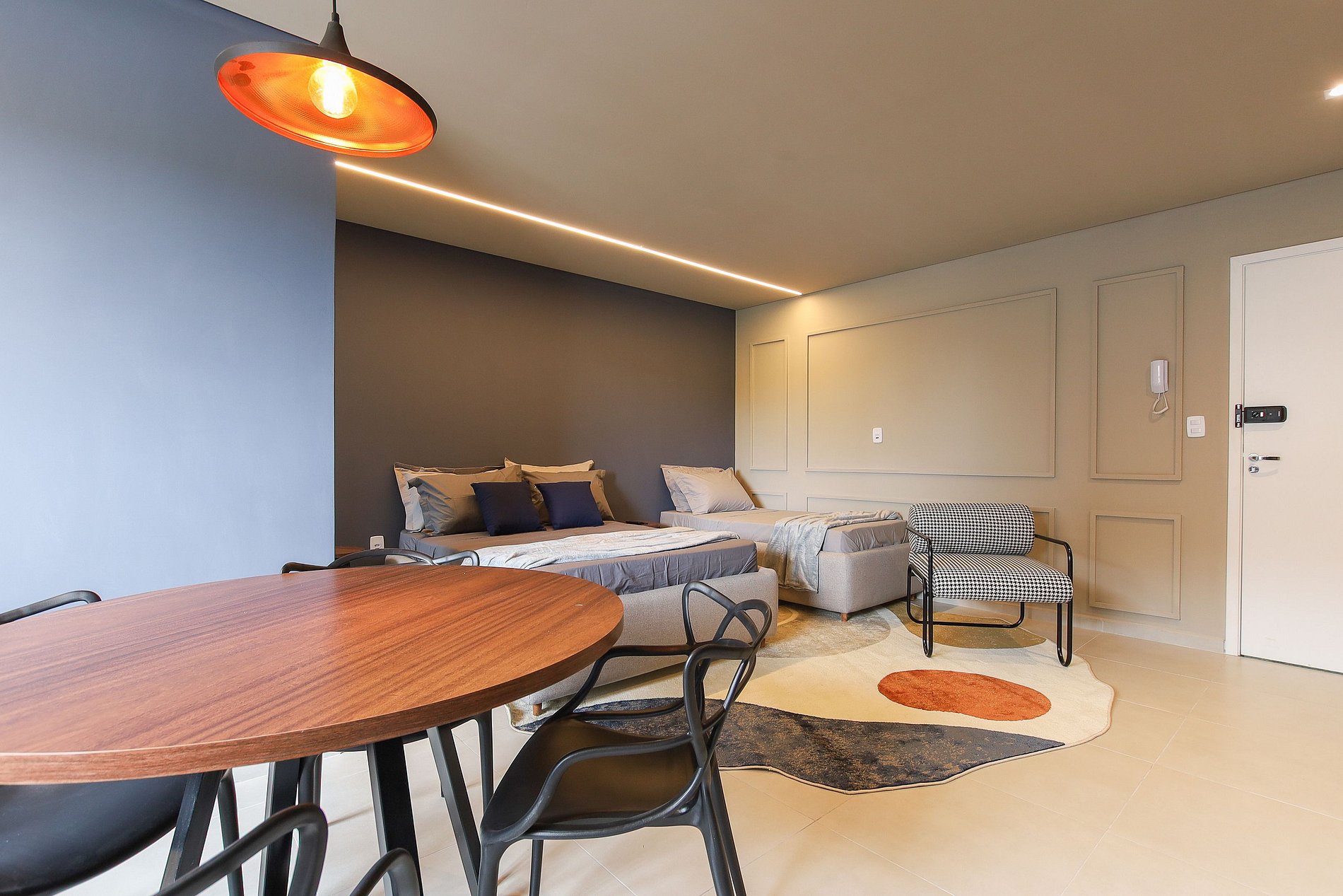 Com uma cama box de casal, uma cama box de solteiro, guarda-roupas, mesa com quatro cadeiras, frigobar, cooktop com duas bocas, micro-ondas, cozinha 100% completa (não possuímos forno), com todos utensílios básicos necessários para a preparação de uma refeição chuveiro elétrico, secador de cabelo, Wi-Fi e tv smart.